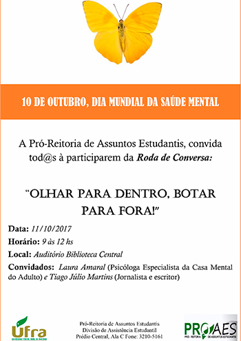 No dia 11 de Outubro, a psicóloga Laura Amaral (CRP 10-04142) participará de Roda de Conversa na Universidade Federal Rural da Amazônia, em referência ao Dia Mundial da Saúde Mental.
